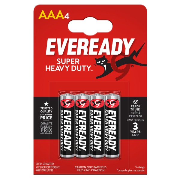 Il marchio EVEREADY® Super Heavy Duty™ offre una linea completa di batterie AA, AAA, C, D, 9V e sono una scelta economica per orologi, torce elettriche, radio e altri dispositivi a basso consumo. Dal 1896 le batterie EVEREADY® forniscono energia portatile affidabile.