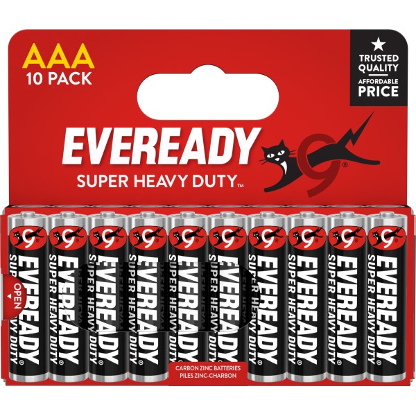 Il marchio EVEREADY® Super Heavy Duty™ offre una linea completa di batterie AA, AAA, C, D, 9V e sono una scelta economica per orologi, torce elettriche, radio e altri dispositivi a basso consumo. Dal 1896 le batterie EVEREADY® forniscono energia portatile affidabile.