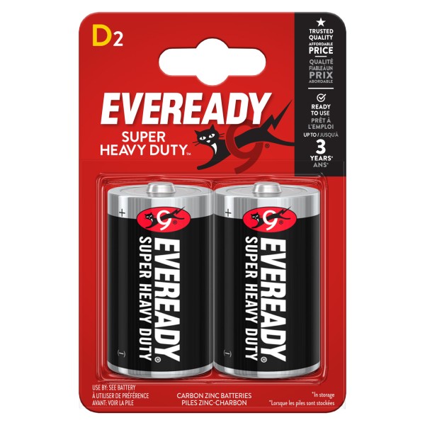 Il marchio EVEREADY® Super Heavy Duty™ offre una linea completa di batterie AA, AAA, C, D, 9V e sono una scelta economica per orologi, torce elettriche, radio e altri dispositivi a basso consumo. Dal 1896 le batterie EVEREADY® forniscono energia portatile affidabile.